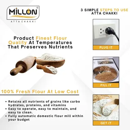 MILLON ATTA CHAKKI : Renowned as the foremost and highly reliable brand in the domestic flour mill industry, MILLON ATTA CHAKKI holds the distinction of being India\'s most trusted and leading provider. With an unwavering commitment to quality, we offer a wide range of flour mills that cater to the needs of every household. Experience the convenience of the MILLON ATTA CHAKKI Model that is not only affordable but also crafted with high-quality materials.