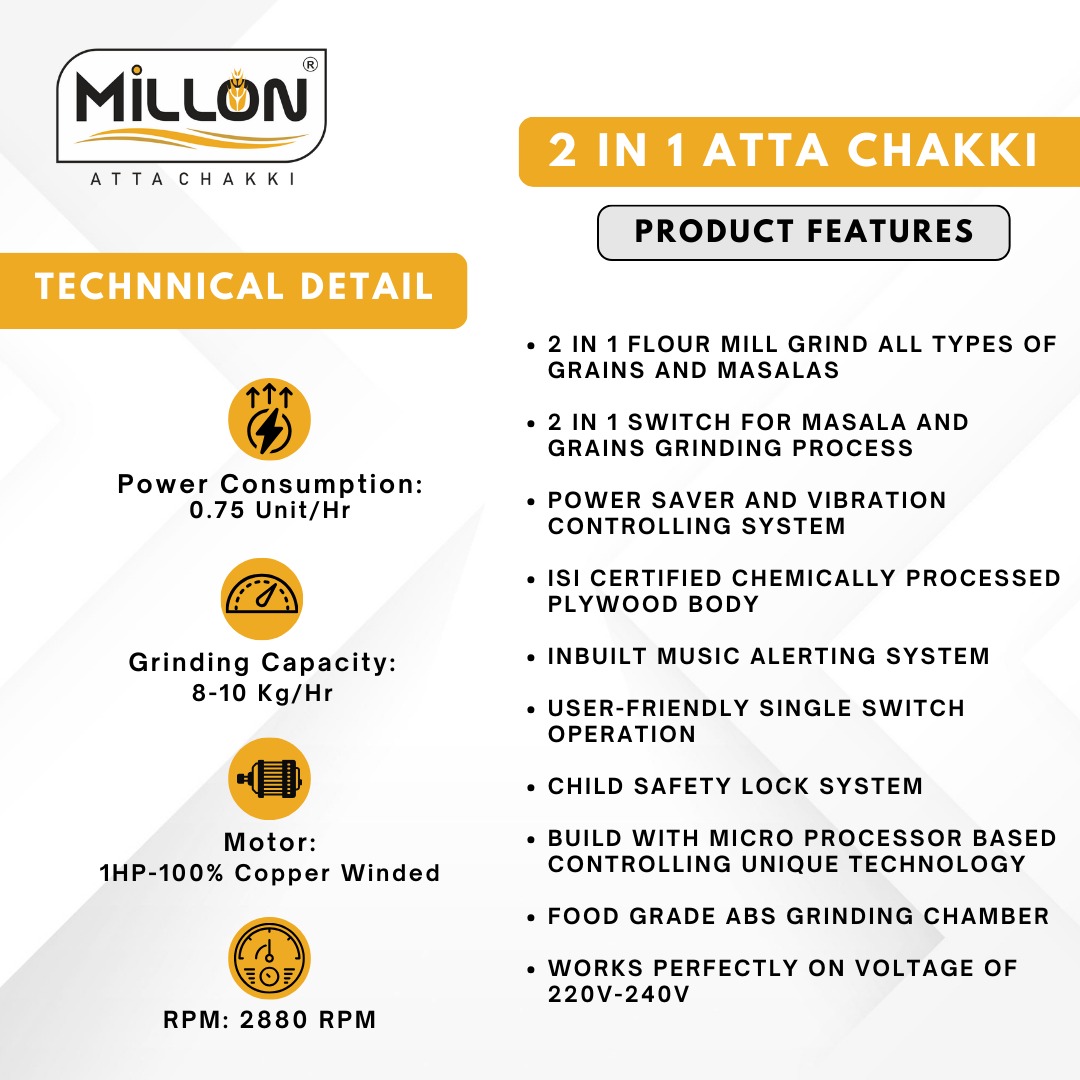 ALIENT FEATURES: MILLON ATTA CHAKKIâ„¢ is The India\'s Trusted Domestic Flour Mill Brand, Domestic flour mill available in your budget. The Millon Atta Chakki is an Easy to operate. The Millon Atta Chakki Flour mill is made with Auto Clean technology so it should start for 2 Minutes even, after the grinding process is over. So it confirms that remaining grains in grinding chamber gets grind completely.